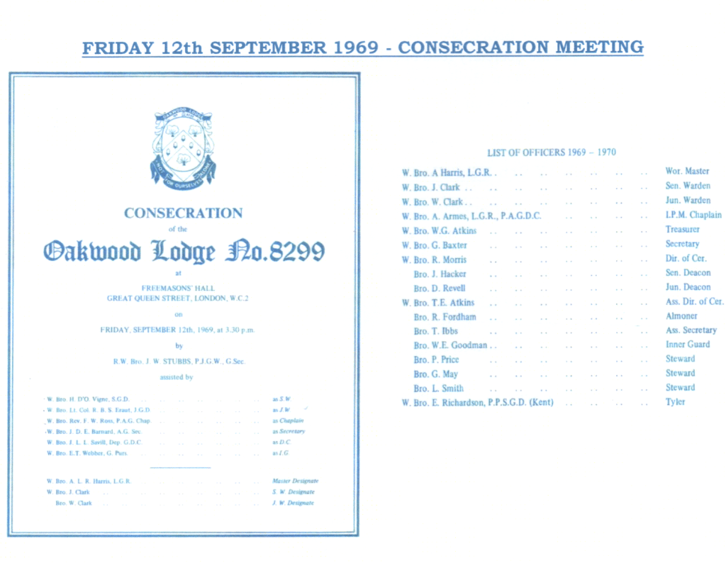 Oakwood Lodge was consecrated on Friday 12th September 1969, at Freemasons Hall, Great Queen Street, London. Below is a snippet of the cover from the Consecration programme.