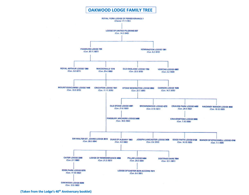 Above you can see the Oakwood Lodge “Family Tree”, where the lodge traces its roots back to Royal York Lodge of Perseverance No. 7, which itself dates to 1751.