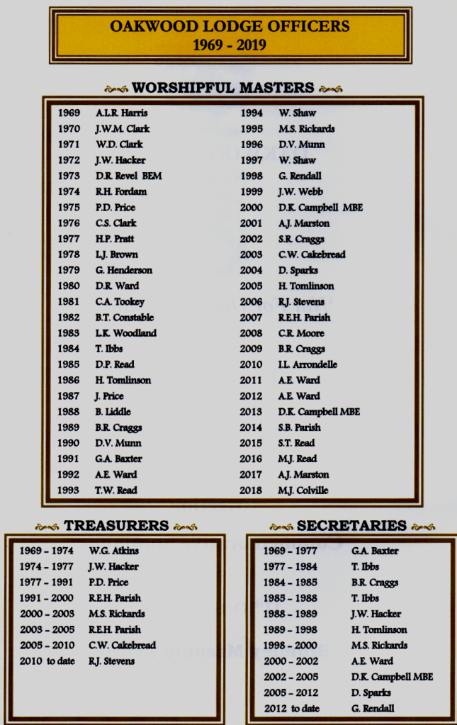 Below is the list of Officers who have served Oakwood Lodge from its consecration in 1969 to the 50th Anniversary in 2019.