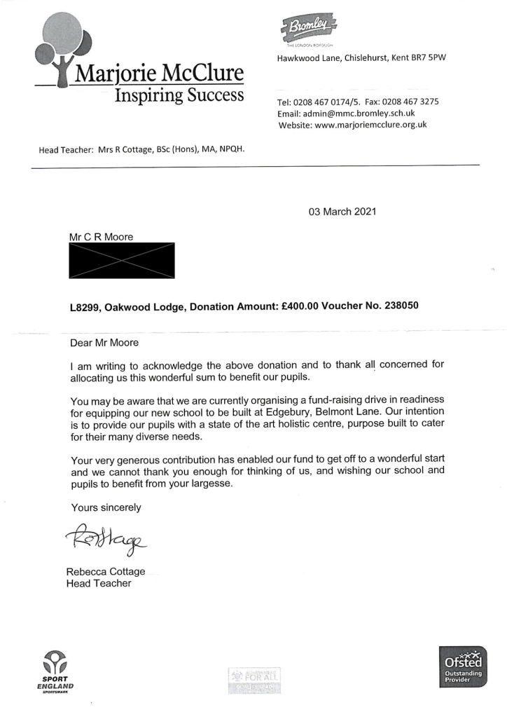 Please see below aa letter from Marjorie McClure School following on from the donation from Oakwood Lodge following the passing of our Brother Ray who was a great supporter of the school.